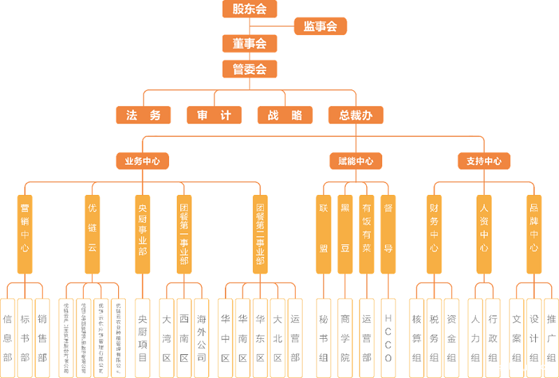中膳设立“集团—区域—分子公司”三级架构网络。全国共有3507名员工,其中管理层281名,一线员工3226名。
