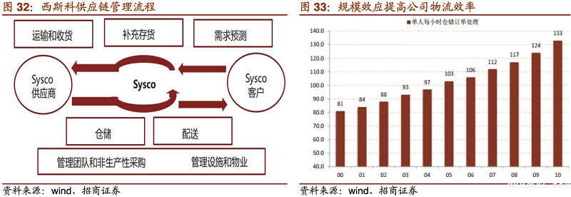 其四,SYSCO有强大的供应链管理能力,保证物流效率。配送中心数量多,通过规模效应降低了人力和物流成本,基本上是用ERP系统开展业务。产品十分丰富,可做到一站式服务,同时涉猎食品和非食品,公司通过专业营销与执行,提升对客户的渗透率与服务黏性。SYSCO销售的毛利率基本上做到了18.7%,销售净利润率做到了百分之二点多。
