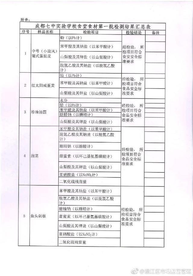 四川发布客户端消息 今天下午,温江区市场监督管理局官微@温江区市场监督管理 发布关于成都七中实验学校食堂食材第一批检测结果的通报。通报中表示,所取样品均在保质期内。