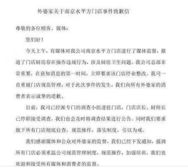 对于上述视频中外婆家存在的问题,3月15日中午,公司创始人吴国平做出回应:发布致歉信称向广大消费者致歉,对门店进行整改并处罚相关责任人,并表示将会对涉事门店进行停业整顿。